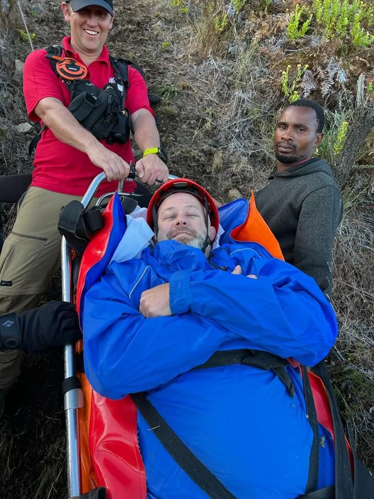 With no air ambulance available, the farm manager sent water and an umbrella for shade. While the rest of the group were guided back down Amy stayed with me and managed to reach mountain rescue. Using What3Words, they found our location and told us they’d arrive in about two hours. Right on 1 pm, they reached the farm and began the hike up to us. They carried me down the mountain, and by 6pm I was in an ambulance on the way to hospital.